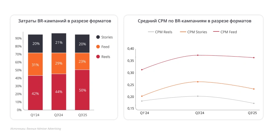 Изменения затронули и структуру рекламных категорий. Ведущие позиции занимают CPG (товары повседневного спроса), Real Estate и Auto - совокупно эти сегменты формируют почти две трети всех размещений. Особенно заметен рост активности в категориях CPG и Health & Pharma, где бренды всё чаще переходят к Brand Response-моделям - инвестируя не только в прямые конверсии, но и в долгосрочные коммуникации с пользователем.[1]