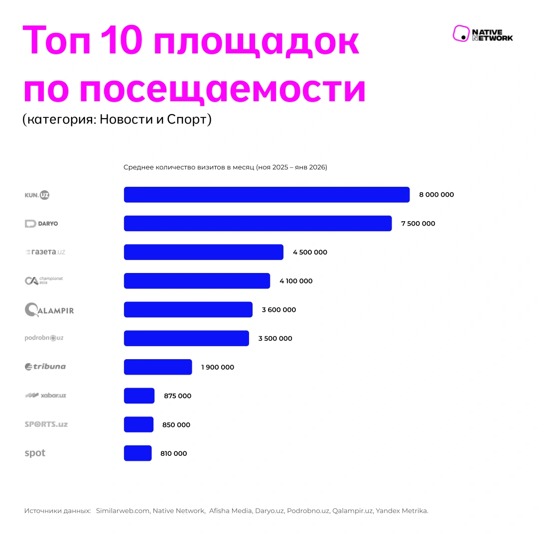 Сегмент новостных и спортивных онлайн-платформ демонстрирует устойчивую динамику трафика. Среди лидеров выделяются Kun.uz (около 8 млн визитов в месяц), Daryo.uz (порядка 7,5 млн) и Gazeta.uz (около 4,5 млн). Эти площадки формируют значимую долю пользовательского внимания и выступают эффективными каналами коммуникации с широкой аудиторией.