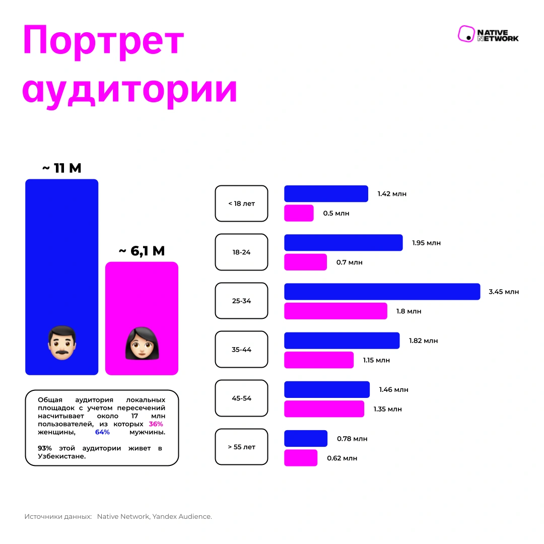 По оценкам экспертов, совокупный охват локальных площадок достигает порядка 17 млн пользователей. Гендерное распределение: около 64% - мужчины и 36% - женщины. При этом до 93% аудитории находится внутри страны, что делает локальные платформы особенно релевантными для национальных рекламных кампаний.